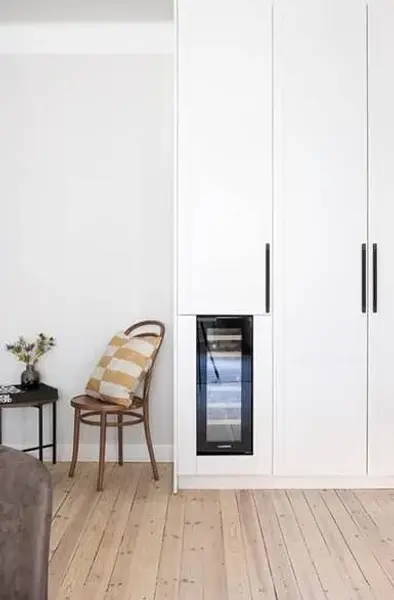 En snygg lösning är att bygga in vinkylen i en garderob. Det ger en stilren och diskret förvaring samtidigt som vinet hålls i rätt temperatur